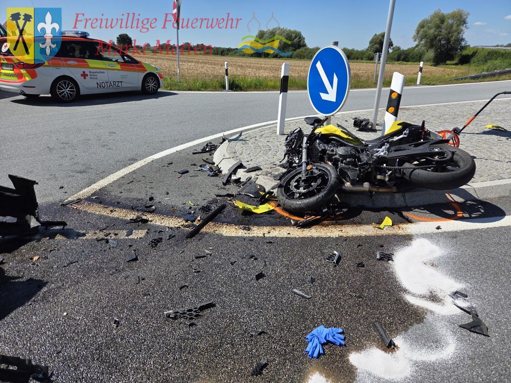 Heute wurden wir zu einem schweren Motorradunfall auf die DEG 15 alarmiert. Es kam zur Kollision zwischen einem PKW und einem Motorrad. Bei Eintreffen unseres ersten Fahrzeuges sicherten wir die Unfallstelle ab, halfen bei der Rettung des Patienten und stellten den Brandschutz sicher. Aufgrund der Schwere des Unfalls wurde ein Gutachter zur Einsatzstelle hinzugezogen, nach über vier Stunden konnten wir die Einsatzstelle wieder verlassen.